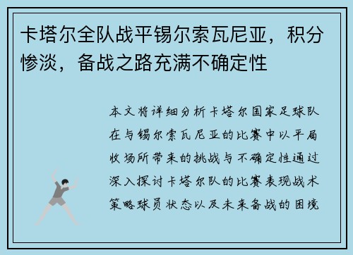 本文将详细分析卡塔尔国家足球队在与锡尔索瓦尼亚的比赛中以平局收场所带来的挑战与不确定性。通过深入探讨卡塔尔队的比赛表现、战术策略、球员状态以及未来备战的困境,文章将为读者呈现卡塔尔队在当下国际足坛环境中的艰难处境。尽管卡塔尔足球近年来取得了显著的进步,但面对如此糟糕的积分与不理想的备战情况,卡塔尔队的未来充满了许多不确定因素。我们将从以下四个方面对这一问题进行详细阐述,分别是:卡塔尔队的整体表现分析、球队战术策略的不足、球员状态的低迷以及未来备战的不确定性。这些因素交织在一起,构成了卡塔尔队面临的严峻挑战,也为其未来的成功之路增添了不少变数。