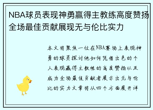 本文将聚焦一位在NBA赛场上表现神勇的球员,探讨他如何凭借出色的个人表现赢得主教练的高度赞扬,以及成为全场最佳贡献者,展示出无与伦比的实力。文章将从四个方面展开详细阐述:一是球员的个人技术突破,二是球员的场上领导力,三是球员的团队合作精神,四是球员在关键时刻的表现。通过分析这些方面,进一步展现这位球员如何在比赛中打出超乎寻常的表现,赢得教练和队友们的高度认可,并在赛后成为全场最佳的亮眼人物。