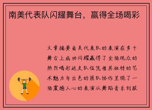 南美代表队的表演在多个舞台上成功闪耀,赢得了全场观众的热烈喝彩。这支队伍凭借其独特的艺术魅力与出色的团队协作,呈现了一场震撼人心的表演。从舞蹈、音乐到服装设计和精神气质,南美代表队的表现无一不让观众为之折服。首先,队伍展现出的激情与活力,完美诠释了南美文化的精神内核;其次,他们在舞台上的精湛技艺与默契配合,使得每一场演出都充满了震撼力;再者,南美代表队的服装与舞台布置体现了浓郁的地方特色,使得他们的演出更加生动与真实;最后,队员们无与伦比的团队合作精神,是他们能够取得如此巨大成功的关键。整场演出通过精致的细节与强烈的情感冲击,获得了观众的高度评价和无数的掌声。本文将详细探讨南美代表队如何通过这四个方面赢得了全场的喝彩。