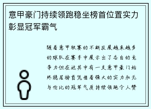 随着意甲联赛的不断发展,越来越多的球队在赛季中展示出了各自的竞争力,但在这其中,有一支意甲豪门始终稳居榜首,凭借着强大的实力和无与伦比的冠军气质,持续领跑,令人赞叹。这篇文章将从四个方面详细阐述意甲豪门是如何持续领跑、稳坐榜首位置,以及其展现出来的冠军霸气,究竟是什么让他们无可撼动。通过深入分析球队的阵容配置、战术打法、球员个人能力以及管理层的战略部署,我们可以更好地理解这支球队的霸气所在,进而为大家展现意甲豪门如何凭借其强大的实力继续主宰意甲联赛。