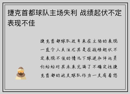 捷克首都球队近年来在主场的表现一直令人关注,尤其是在战绩起伏不定、表现不佳的情况下,球迷和评论员们纷纷对其未来充满了不确定性。捷克首都的这支球队,作为一支有着悠久历史的足球队,曾多次在国内联赛和欧洲赛事中取得过辉煌成绩。然而,近年来,这支球队在主场的失利频频发生,战绩也时常处于起伏不定的状态,表现不佳的情况引发了各方的热议。本文将从四个方面详细探讨捷克首都球队主场失利、战绩不稳定及其原因,分别是球队战术的不足、球队阵容的变化、主场氛围的影响以及管理层的决策问题。在对这些因素进行分析之后,最后将对球队未来的改进和发展提出一些思考。